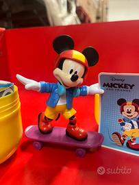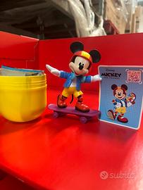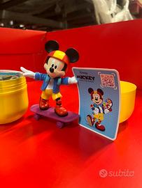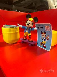 Sorpresa Kinder con personaggio di Topolino su skateboard. ヘ - Personaggio di Topolino con elmetto, giacca e pantaloncini. - Include una carta con personaggio di Topolino e amici. - Contenitore giallo a forma di uovo.