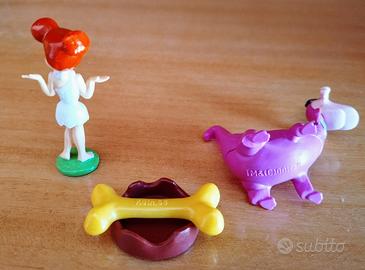 Due sorpresine dei Flintstones: Wilma, gadget Parmalat, e Dino con osso e ciotola, della Kinder.