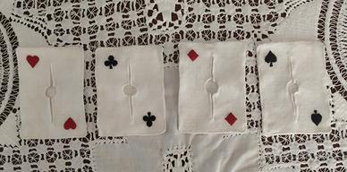 Delizioso set di 4 sottobicchieri ricamati a mano risalenti agli anni '40/'50, perfetti per gli amanti del vintage e dell’artigianato. Ogni sottobicchiere, in tessuto bianco, rappresenta uno dei semi delle carte da gioco: cuori, fiori, quadri e picche, finemente ricamati con filo rosso e nero.