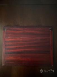 Elegante e funzionale accessorio da scrivania realizzato a mano in legno e pelle e cavallo in metallo. In ottime condizioni generali, a parte (guarda ultima foto) piccolo foro facilmente riparabile con un po' di stucco.