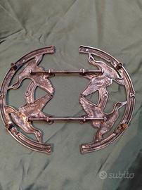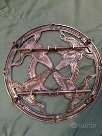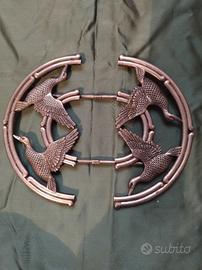 Sottopentola vintage francese Silea Flying Duck in metallo, caratterizzato da un motivo raffigurante anatre volanti, attribuito al marchio francese Silea. Progettato per essere funzionale come porta pentole calde e decorativo per la tavola.