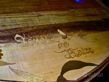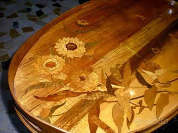 Tavolino di servizio parlante firmato Gallé , in legno di noce intarsiato con essenze diverse e tinte , di gusto art nouveau.