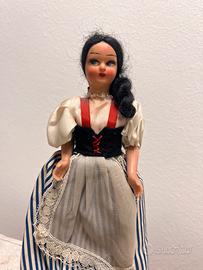 Souvenir bambola vestita con un costume tradizionale, che ricorda gli abiti tipici di alcune regioni europee, come quelli bavaresi o tirolesi, caratterizzati da una gonna a righe, un corpetto scuro con allacciatura rossa e una camicia bianca con maniche a sbuffo. La bambola ha capelli scuri raccolti e un'acconciatura laterale. Vintage anni 70, presenta alcuni segni del tempo