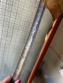 Il tempo e la ruggine l’hanno un po rovinata ma con un buon lavoro di restauro potrebbe tornare a splendere. Sulla lama sono incisi dei disegni