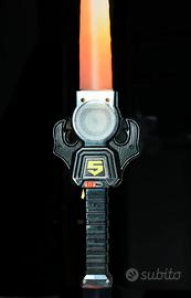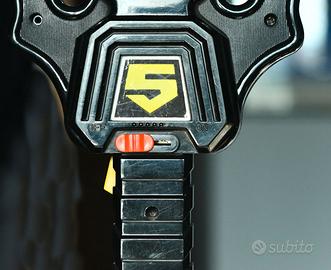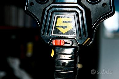 Introvabile spada giocattolo anni '90 con suoni e luci. Un pulsante sull'impugnatura aziona un suono di esplosione. Un commutatore a 5 posizioni seleziona 4 diversi suoni dell'impatto della lama. Lunghezza 65 cm, larghezza 13,5 cm.Esteticamente in ottimo stato e perfettamente funzionante, con 4 pile AA comprese. prova e ritiro a Roma zona Colli Aniene.