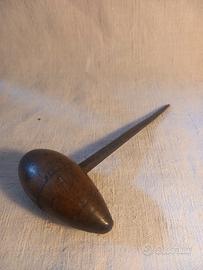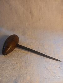 Attrezzo per sgranare le pannocchie di mais in ferro e manico in legno, con una curiosa forma a uovo.
