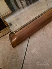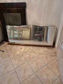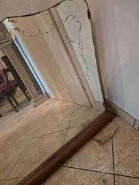 Questo oggetto è una specchiera d'epoca, probabilmente risalente agli anni '30 o '40, caratterizzata da una forma sagomata e decorazioni incise sul vetro. Stile: Presenta elementi tipici del design italiano di quel periodo, con possibili influenze Art Déco o del primo modernariato. Caratteristiche: Il vetro è molato e presenta sottili incisioni floreali o astratte nella parte superiore. Struttura: Lo specchio è appoggiato su una base in legno. Valore: Specchiere simili di produttori noti come Fontana Arte possono avere un valore collezionistico significativo. Specchio da parete o appoggio di grandi dimensioni Misure in cm Altezza 70 Lunghezza 160 Profondità 7