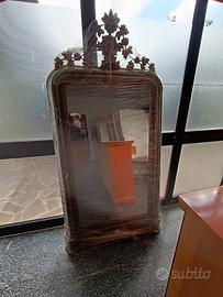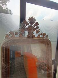 Vendo specchiera anticacon una cornice in legno riccamente intagliata e una cimasa (il coronamento superiore) elaborata a motivi floreali o fogliacei. Un pezzo d'antiquariato ben conservato, probabilmente risalente al XVIII o XIX secolo. Specchiere simili sono spesso identificate negli stili: Luigi XVI: Caratterizzato da linee eleganti e cimase raffinate, spesso dorate in foglia oro. Luigi XV (Rococò): Noto per le forme più sinuose, asimmetriche e i ricchi intagli a tema naturale. Barocco: Caratterizzato da una decorazione molto sfarzosa e imponente. Si accettano offerte. NO perditempo.