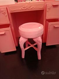 Set specchiera e comodinoLiving Pretty Barbiedel 1987. Il set include una specchiera a tre ante, uno sgabello e un comodino separato. Tutti i cassetti e gli sportelli sono funzionali e si aprono. Include vari accessori in miniatura come spazzole, pettini e flaconi di profumo. Fa parte di una linea di mobili per la casa di Barbie prodotta da Mattel negli anni '80. La specchiera è leggermente ingiallita a causa del tempo lo specchio ha dei gancetti rotti ma sta comunque attaccato alla specchiera usura del tempo.