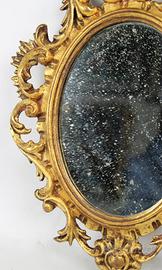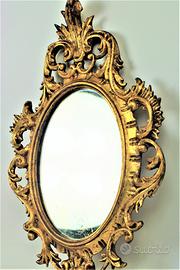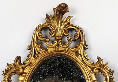Originale e preziosa specchiera con cornice traforata, intagliata a volute e motivi floreali con cimasa aggettante.