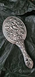 Piccolo specchio da toletta, da collezione in argento 900 con manico , lavorazione artigianale a sbalzo, eseguita interamente a mano, specchio molato al piombo, peso totale 41 gr, misure cm 13 x 5,3.
