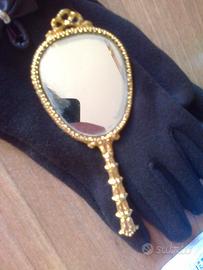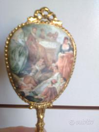 Specchietto da borsetta, anni '50. Metallo dorato che non scurisce con il tempo. Manico e cornice lavorati; retro leggermente imbottito in raso con scena dipinto Rinascimento. Mai usato ma Il vetro ha qualche punto leggermente opacizzato dal tempo. cm 15x5. Pagamento in contanti se consegnato a mano a Milano, oppure pagamento e spedizione tramite "Tutto Subito" con prezzo spedizione aggiuntivo di euro 10