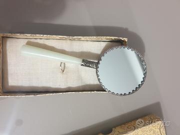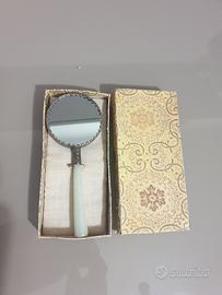 specchietto da borsetta orientale anni70 con manico in giada ,e contorno specchio argentato molto bello con scatola.