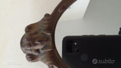 L'oggetto in primo piano è uno specchio a mano con un manico finemente decorato. Il suo stile, con motivi floreali e forme sinuose, è comunemente associato al periodo Art Nouveau (noto anche come Stile Liberty). Questo tipo di specchi da toeletta venivano realizzati in materiali come l'ottone o l'argento e sono oggi considerati articoli vintage o d'antiquariato. in buone condizioni