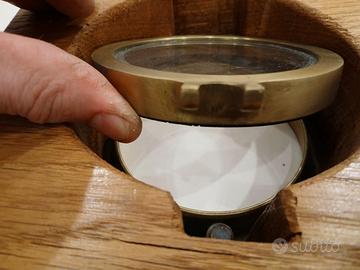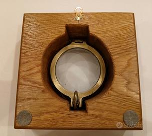 Specchio a oblò nautico antico in ottone con cornice in legno. Diametro 12 cm. Misura 23 x 23 x h.12 cm