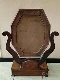 specchio da tavolo antico in legno massello, probabilmente risalente al XIX secolo. Presenta una base con cassetto e uno specchio ottagonale girevole. Alto cm 72 Largo cm 52 Vendo euro 40 Consegna a Roma Non spedisco
