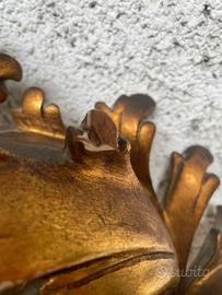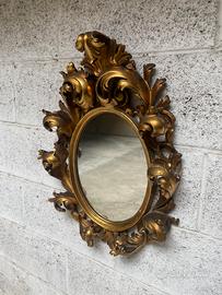 Vecchio specchio in stile barocco intagliato a foglia d’oro,presumibilmente anni 40/50 in buone condizioni,con qualche segno del tempo,un paio di punte rotte sul fogliame,per il resto tutto come evidenziato in foto.
