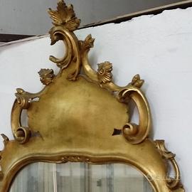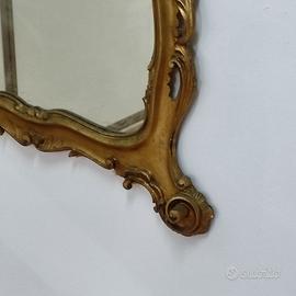 Specchio con cornice dorata, lo stile Luigi XV. Il telaio è decorato con foglie stilizzate e fregio floreale ed è coronata da un grande seme a forma di cresta asimmetrica. dimensioni 150x80cm prezzo 100 euro