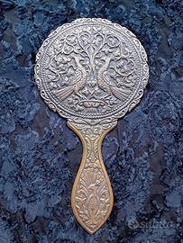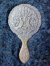 Antico specchio rotondo con manico in pesante metallo lavorato, decori con figure di pavoni in rilievo, in buone condizioni Misure: cm. 23 x 13. Peso: gr.527 Euro 35 Tel. 3391601948