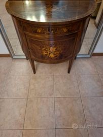 Vendo specchio con cornice in lamina color oro e mobiletto mezza luna anticato con anta centrale e cassetto , puro legno con decorazioni degli ANNI 60 in ottimo stato.
