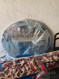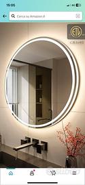 Ecco qui un bel specchio rotondo fatto in Italia credo che sia anche illuminato perché ci sono i fili elettrici è stato comperato pagato quasi 350 € mai mai usato è un cristallo speciale che non si appanna mai ed è un prodotto in Italia molto molto valido no Duravit no Ikea no ideal