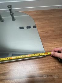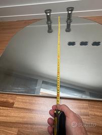 Materiali: Lastra di vetro specchiata e priva di cornice, con bordi smussati (filo lucido). È dotato di due applique a muro cromati lucidi nella parte superiore, che fungono da fonte di illuminazione integrata.