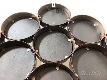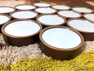 Specchio da parete Vintage Anni 80 di manifattura Italiana. Specchio da parte romboidale in metallo anticato, composto da 16 specchi rotondi. Lo specchio è dotato di doppio gancio per essere appeso sia in orrizontale che in verticale. CONDIZIONI PERFETTE Misure: Altezza cm 63 - Larghezza cm 97 - Profondità cm 4