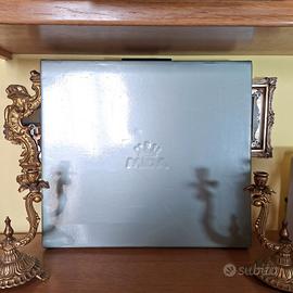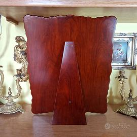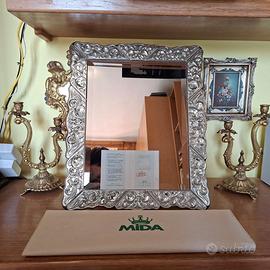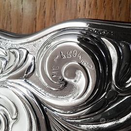 Specchio da tavolo di lusso dell'anno 2004 in Argento 925 realizzato a mano dai prestigiosi argentieri di Recanati MIDA. Formato Grande Misure esterne: 37x46 cm Misure interne specchio: 27x35 cm Peso: 2,8 kg Materiale: Argento 925 Marca: MIDA ARGENTI Stile: BAROCCO Materiale retro: Legno massello pregiato Luogo di produzione: Recanati Nuovo, mai utilizzato, ancora nella sua scatola originale Spedizione con assicurazione DAL 1974 NEL SETTORE ARGENTIERO Mida nasce nel 1974 a Recanati, un borgo stretto tra il mare e la bellezza incontaminata delle colline. Immersa nella poesia di Leopardi e ispirata dalla creatività dei suoi artisti, Mida fu una delle prime aziende argentiere che, in breve tempo, raggiunse una posizione di prestigio nel settore dell’idea regalo e del complemento d’arredo in argento. Grazie a strategie imprenditoriali efficaci e vincenti, Mida, oggi parte di un importante Gruppo, rappresenta una realtà imprenditoriale solida e prestigiosa, espressione concreta di un brand apprezzato per la sua grande qualità. La filosofia che ispira il lavoro del Gruppo è plasmare l’argento con immaginazione e creatività, grazie a lavorazioni accurate e artigianali che infondono negli articoli in argento la tradizione e l’eleganza del saper fare italiano. Passione, inventiva, materiali accuratamente scelti, produzione in Italia e distribuzione esclusiva in gioielleria sono i tratti distintivi di un Gruppo di aziende conosciute per la qualità dei prodotti e per la cultura del bello, autentica espressione del Made in Italy. Per qualsiasi informazione non esitate a chiedere