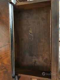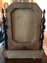 Elegante specchio da comò o da tavolo in legno di noce scuro impiallacciato ed intagliato Colonne laterali tornite con specchio a bilico filettato e cassetto inferiore piedini quadrati Databile ai primi del '900 Stile liberty Ideale come specchiera sopra comò.