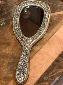 Specchio da toiletta a mano in argento 925 con retro in legno nuovo. Ritiro in zona o spedizione a carico dell'acquirente.