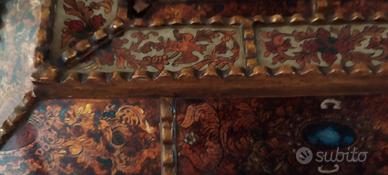►SU VETRO VERNICIATO ROVESCIO -------- storia: Nel XV secolo arrivò in Perù il vetro portato dagli spagnoli in specchi e cornici destinati a decorare chiese, conventi e palazzi del Vicereame. Gli spagnoli portarono le famose perle anche dall'isola di Murano, vicino a Venezia (Italia), dove tra il XVIII e il XIX secolo ebbe luogo la più grande produzione di vetro e cristallo. Le tecniche di vetro colorato spagnole, di influenza araba, furono copiate e modificate dagli artigiani peruviani. Svilupparono nuovi stili regionali, come l'Andahuaylino (con cornici in vetro dipinto sul retro), il Cajamarquino (vetro completamente dipinto), il Cusco (cornici in legno intagliato che includono vetro dipinto), il misto o Cuscaja (uso della foglia d'oro in nell'intaglio delle cornici e nella pittura dei vetri) e policromo (uso di varie tonalità policrome). Questi stili possono essere visti nelle collezioni dei musei e nella decorazione degli altari nelle chiese e nei conventi in diverse regioni del paese.