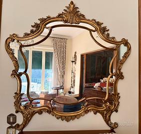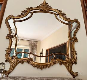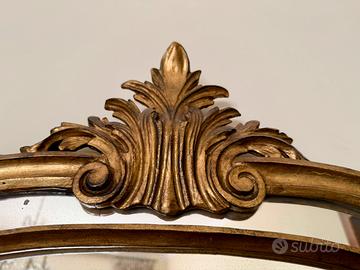 Elegante specchio con cornice in legno intagliato e finitura dorata.
