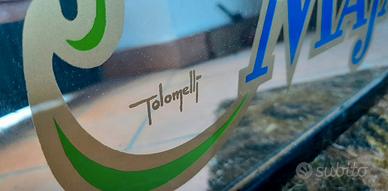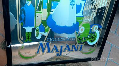Antico quadro a specchiera pubblicitario cioccolato Majani Torino, vintage, con logo Fiat, firmato Tolomelli e auto d'epoca. Made in Italy. Misure H 73 x L 53 cm con cornice esterna in legno laccato. Perfetto. Ove possibile consegna a mano, diversamente posso spedire.