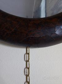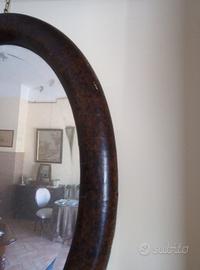 Specchio ovale antico con cornice in legno dipinto in finta radica, con vetro molato, originale, conservato. Oggetto gradevole di epoca primo '900, necessita di un leggero ritocco di lucidatura. Adatto per ogni tipo di ambiente. Mis. cm 37x49 Per info 340 6203846 o WhatsApp.
