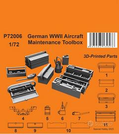 Special Hobby codice P72006 cassetta attrezzi e accessori tedeschi scala 1/72. Kit nuovo sigillato, e completo come da fotografie. Kit in resina stampata, dettaglio ideale per un diorama. Disponibile per spedizione o ritiro in zona.