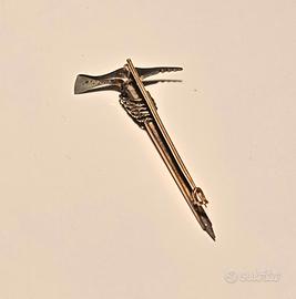 spilla antica alpini, rappresentazione di una picozza decorata con corda da arrampicata. bronzo e acciaio