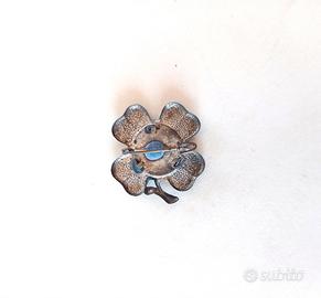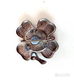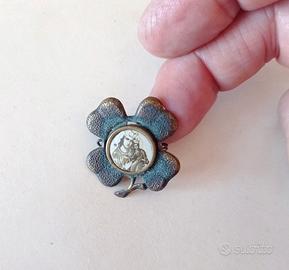 Rara spilla antica devozionale a forma di quadrifoglio con al centro una stampa della Madonna di Materdomini.