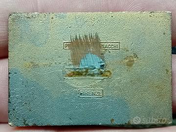 scudetto da giacca abbastanza vecchia. è priva di spilla per appuntare e mancante di qualche pezzo di vernice rossa. si legge sul retro Firenze probabilmente dove è stata realizzata.