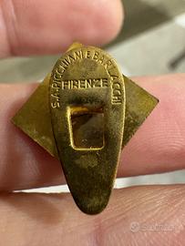 Questa spilletta è un oggetto di interesse storico legato al periodo del Ventennio Fascista in Italia. Si tratta di un distintivo che combina simbologia politica e militare. Ecco un’analisi dettagliata : 1. Identificazione del Soggetto Il fregio metallico applicato sulla base smaltata bianca rappresenta un Fascio Littorio, il simbolo principale del Partito Nazionale Fascista (PNF). • Il design: La forma a rombo con le due bande orizzontali dorate su sfondo bianco suggerisce che si tratti di un distintivo di specialità o di appartenenza a un'organizzazione specifica del regime (come la MVSN - Milizia Volontaria per la Sicurezza Nazionale, nota come "Camicie Nere", o le organizzazioni giovanili/universitarie). • Il produttore: Sul retro è chiaramente leggibile la scritta "S.A. PICCHIANI E BARLACCHI - FIRENZE". Si tratta di una delle ditte italiane più celebri e prestigiose nel campo della medaglistica e dei distintivi, attiva fin dal XIX secolo e fornitrice ufficiale di moltissimi enti statali e militari dell'epoca. La qualità della fattura è tipica di questa azienda.