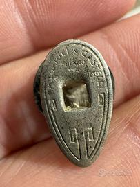 spilla interessante per la sua variante di forma e colore, che nel linguaggio della propaganda fascista aveva significati precisi. Ecco l'analisi dettagliata: 1. Identificazione e Simbologia Forma circolare e presenta uno smalto di colore rosso. • Il Simbolo: Ritroviamo il Fascio Littorio in rilievo, accostato a due bande orizzontali argentate su fondo rosso. • Significato del colore: Nel contesto delle organizzazioni del Ventennio, il rosso era spesso associato ai Giovani Fascisti o a formazioni d'assalto e d'azione. La forma circolare e la combinazione cromatica servivano a distinguere immediatamente il ruolo o l'anzianità del portatore rispetto a chi indossava i distintivi bianchi o azzurri. • Il produttore: Sul retro è inciso il marchio "S. JOHNSON - MILANO" (si legge anche l'indirizzo storico di via Gorani). Lo stabilimento Stefano Johnson è stato, insieme a Picchiani & Barlacchi, il più importante produttore italiano di medaglie e distintivi, noto per l'altissima qualità artistica delle sue incisioni.