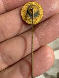 Questa spilla è un pezzo di militaria italiana risalente al periodo fascista. presenta un attacco a spillo lungo (da giacca) . Spiegazione Storica • Organizzazione: Si tratta di un distintivo dell'Opera Nazionale Balilla (ONB). • Grado e Categoria: Il fondo in smalto verde e i due galloni dorati (le "V" rovesciate) indicano il grado di Caposquadra degli Avanguardisti (i giovani tra i 14 e i 18 anni). • Simbologia: Il fascio littorio posizionato verticalmente a sinistra è il simbolo iconico del regime, mentre i galloni a destra indicano la posizione di comando all'interno della squadra. • Produttore: Sul retro è chiaramente leggibile "F.M. LORIOLI & CASTELLI - MILANO", con l'indirizzo storico di Via Bronzetti 25. La Lorioli è stata, insieme alla Johnson, la più importante ditta produttrice di medaglie e insegne del Ventennio.