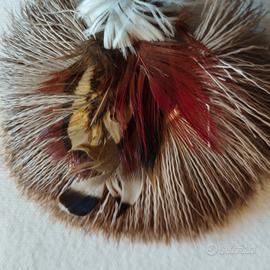 spilla decorativa con pelo di capriolo e piume naturali design a ventaglio cm. 10 x 8