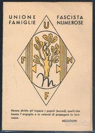 L’Unione Fascista Famiglie Numerose (o UFFN) fu un ente pubblico assistenziale italiano del periodo fascista, istituito con R.D. 3 giugno 1937, n. 805. Scopi dell’UFFN erano l’assistenza e il sostegno alle famiglie numerose tramite una serie di benefici, inizialmente riservati solo ad impiegati e dipendenti dello Stato e di enti pubblici, ma successivamente a tutti i capofamiglia con più di sette figli conviventi e a carico (L. 20 marzo 1940, n. 267). L’organizzazione era presente in ogni comune italiano. Con il D.L. 2 agosto 1943, n. 704, l’UFFN mutò denominazione in Unione fra le Famiglie Numerose. Con D.L. 29 marzo 1945, n. 267, l’UFFN fu soppressa e le sue funzioni furono trasferite alla preesistente Opera Nazionale Maternità e Infanzia, ente istituito nel 1925 e soppresso nel 1975, e le cui funzioni sono oggi di competenza del Servizio Sanitario Nazionale. Sul prospetto delle tessere degli aderenti (allegato il frontespizio in copia) vi era una frase di Benito Mussolini: «Hanno diritto all’Impero i popoli fecondi, quelli che hanno l’orgoglio e la volontà di propagare la loro razza».