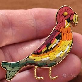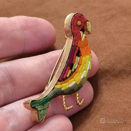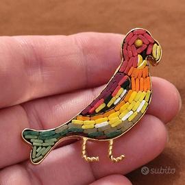 Spilla pappagallo in micro mosaico vintage Coloratissima e particolare spilla a pappagallo vintage anni ’60 in micro mosaico “bizantino”. Pezzo di artigianato vintage tipico fiorentino (Firenze); è realizzata con pezzettini tagliati da listarelle di vetro di murano, posizionati a mano e incollati con stucco. Rilegata in metallo dorato. Spilla con fermatura di sicurezza. Disponibile alla consegna a mano a Firenze zona stadio o Cure