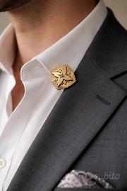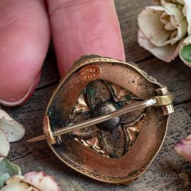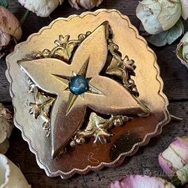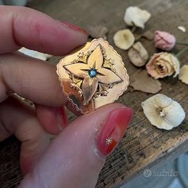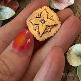 Non nasce per brillare da lontano. È uno di quei pezzi che si avvicinano piano, e poi restano perché non riesci a separarti dal suo colore caldo. Quattro petali si aprono al centro, come una piccola stella domestica, con un punto blu ghiaccio perlato che trattiene lo sguardo senza mai forzarlo. Intorno, una trama sottile di foglie e rilievi accompagna la forma, mentre la base ondulata riflette la luce con discrezione, come se fosse stata pensata per un abito preciso, un gesto preciso. Sul retro compare una dicitura che racconta molto più di quanto sembri: “Titre Fix”. Non è oro pieno, ma una tecnica ottocentesca francese di placcatura spessa, realizzata per durare nel tempo e mantenere l’aspetto e il calore dell’oro vero. Una scelta consapevole, già allora, per un gioiello destinato a essere indossato a lungo. È una spilla che appartiene a un’epoca in cui anche i dettagli quotidiani avevano un’intenzione. E forse, ancora oggi, sa trovare il suo posto proprio lì: vicino al cuore, senza bisogno di spiegarsi. Perfetta nella sua straordinaria eleganza sia per uomo sia per donna. • Tipologia: spilla antica • Epoca: fine ‘800 – primi ‘900 • Materiale: metallo con placcatura oro “Titre Fix” • Decoro: motivo floreale/stellato a rilievo • Chiusura: perno lungo originale senza sicura • Condizioni: buone, coerenti con l’età