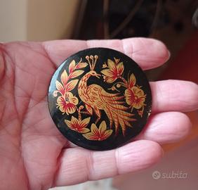 Rara spilla vintage sovietica, Arte Palech, con raffigurato un uccello di fuoco, tipico del folclore russo.