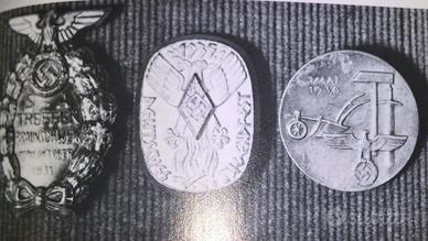 Spilla tedesca d'epoca nazista per membri della "Hitlerjugend" (HJ) ovvero "Gioventù Hitleriana", nel corso della loro festa del 1935. Infatti, era in quel tempo consuetudine, celebrare ogni anno da parte degli appartenenti, la festa della HJ in Germania e questo fu il "gadget" coevo, coniato per l'occasione. La spilla è stata realizzata in lega di tombacco argentato fusa a freddo. Vedasi "giusti" riferimenti a pag. 145 del testo: "MILITARIA DEL TERZO REICH" a firma di Robin LUMSDEN. La stessa si presenta in "OTTIME" condizioni di conservazione, ancora in patina d'epoca. Misure: 40 mm x 30 mm.