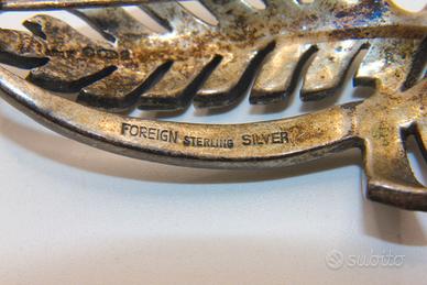 Questa affascinante spilla vintage in argento e marcasite è un vero gioiello Art Déco. La sua forma delicata, che richiama una foglia stilizzata, e le linee sinuose creano un'opera d'arte miniaturizzata. Ogni dettaglio è curato con maestria: l'argento, metallo nobile e luminoso, fa da base a una miriade di piccole pietre di marcasite che scintillano alla luce, donando alla spilla un'eleganza senza tempo. I due nastri in argento che avvolgono la foglia aggiungono un tocco di movimento e dinamismo al design, rendendo questa spilla un accessorio versatile e adatto a diverse occasioni. Con le sue dimensioni contenute di 49x22 mm e un peso di 9,3 grammi, questa spilla è perfetta per essere indossata senza risultare eccessivamente ingombrante. La chiusura a perno assicura una presa sicura sull'abito. Questo gioiello è un vero pezzo da collezione