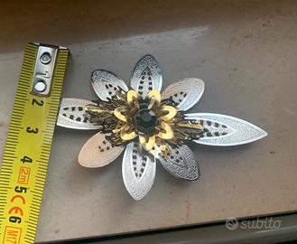 bellissima spilla vintage anni 90 a forma di fiore, dorata e argentata con pietra nera centrale, metallo, misure in foto, nessun difetto, mai utilizzata