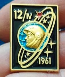 Spilla vintage del lancio lunare dello Sputnik Sovietico con l' astronauta Gagarin 1961 in ottone placcato 2 x 6 cm circa